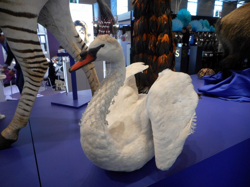 Zèbre, cygne, lièvre, sanglier... accueillaient les visiteurs et présentaient les bijoux de créateurs. La scénographie, à la fois surprenante et très originale, offrait un spectacle inhabituel pour un salon de mode. Cette présentation apportait une touche décalée au Salon du bijou. Le mélange de fourrure animale et de bijoux fantaisie marchait très bien. En tout cas, moi, ça m'a plu. Est-ce à cause de mon amour pour les animaux ?